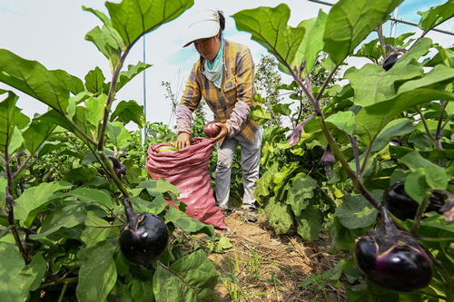 8月10日,采摘工忙著采收新疆長茄、圓茄。