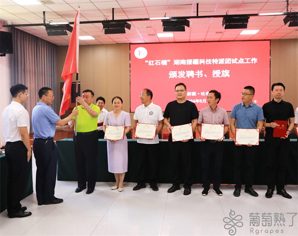 吐魯番市相關部門向“紅石榴”湖南科技特派團特派員頒發聘書并授旗。劉字昂攝