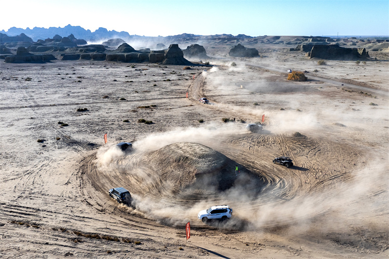10月5日,在2024達喀爾英雄挑戰賽世界魔鬼城計時排位活動中,游客駕駛越野車參賽。閔勇 攝