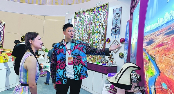 9月13日,在第六屆運博會上,新疆文旅推薦官克州形象代言人可蘭白克·馬坎向江蘇游客推介克州旅游景點。宋衛國攝