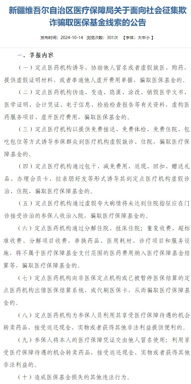 新疆維吾爾自治區醫療保障局公布的欺詐騙取醫?;鹁€索舉報內容。