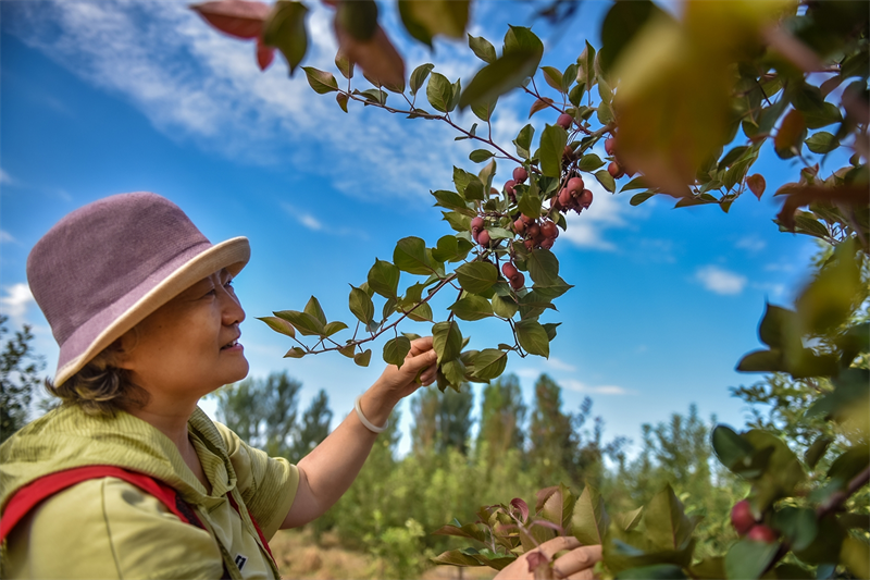 9月22日,克拉瑪依市農業綜合開發區庭院內,市民在欣賞秋天的果實。田國建攝