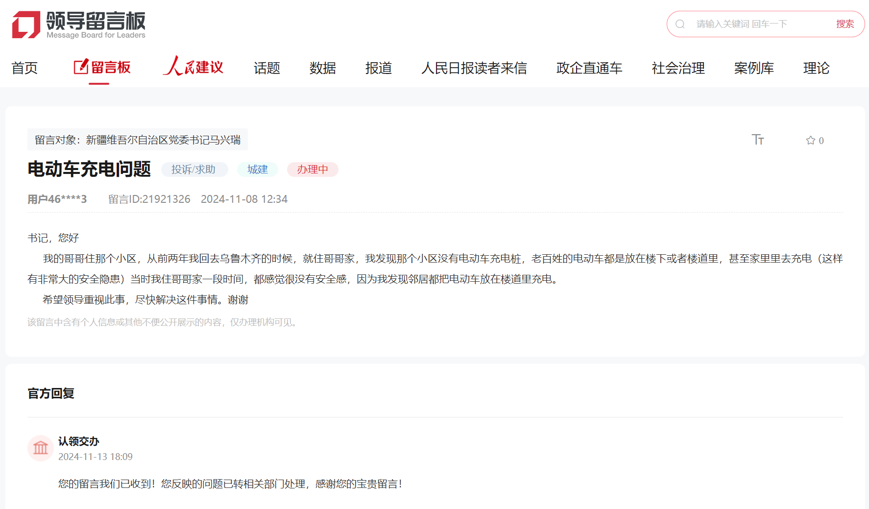 “小區沒有電動車充電樁,很多人在樓下、樓道里或家里充電,這樣存在非常大的安全隱患?!苯?,一網友在人民網“領導留言板”新疆板塊留言表示很沒有安全感。
