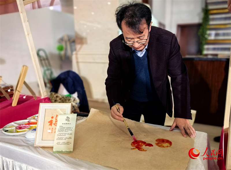非遺“桑皮紙上的中國畫”傳承人魏寶山,帶來了二十多幅用新疆非遺桑皮紙精心創作的《?!贰洞汗潯贰洞喝A秋實》等書畫作品參展,并現場用桑皮紙為觀眾寫“?!彼汀案!?。他說,中華民族的傳統節日“春節”被聯合國教科文組織列入非物質文化遺產代表名錄,是全中國人的大喜事,今天用新疆非遺桑皮紙書寫人類非遺“春節”,是美好祝福,也是傳承弘揚非遺文化。