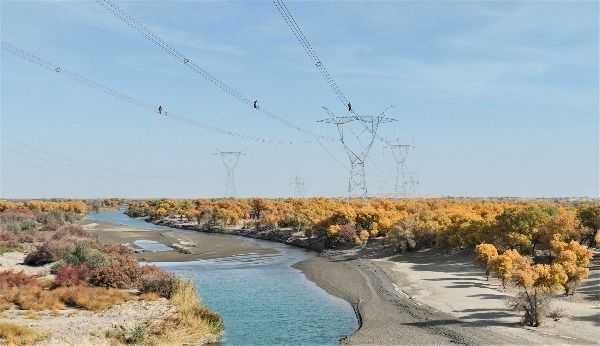 作為我國沙漠線路路徑最長的750千伏輸變電工程,工程超過90%的線路都在塔克拉瑪干沙漠南部,有近400千米線路從沙漠中穿過。沙漠流動性大、風力強,導致沙漠鐵塔基礎開挖成型率極低。建設者采用壘沙袋、擋沙板等辦法預防基礎開挖過程出現的塌方問題。此外,工程有176.9千米線路穿越博斯騰湖景區、臺特瑪湖濕地公園及胡楊林,建設者將生態保護理念貫穿工程建設全過程。