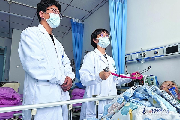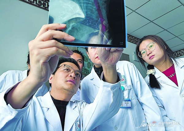 12月13日,天津援疆醫療專家(左一)和于田縣人民醫院醫生一同分析患者病情。