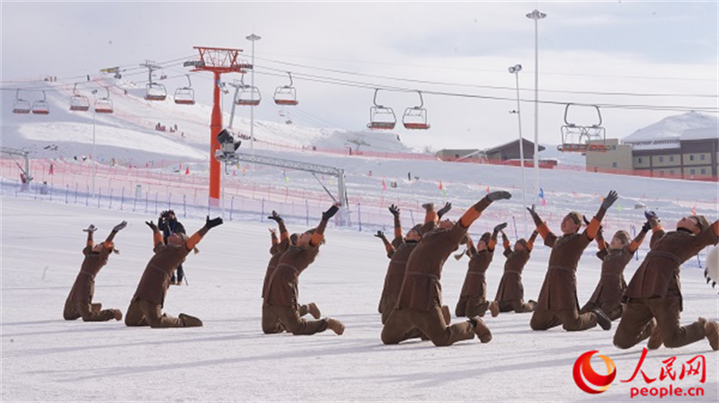 1月12日,第二屆“冰雪絲路 中國雪都”環阿爾泰山冬季運動會在阿勒泰將軍山國際滑雪度假區開幕。圖為開幕式上舉行的文藝表演。人民網 王欲然攝