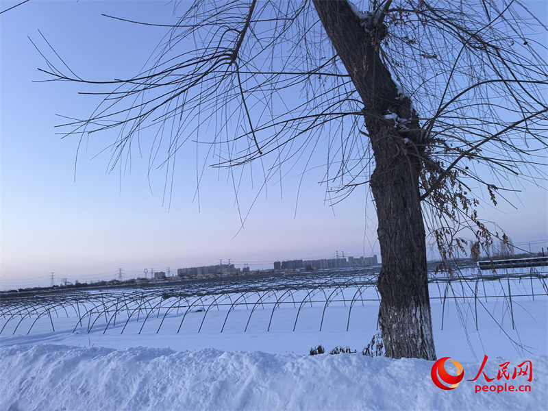 天山腳下,青格達湖邊,下了一天一夜的大雪剛停,劉建軍就去了隔壁新聯村的清潔能源智能溫室育苗大棚,看看前幾天育的茄子發芽了沒。