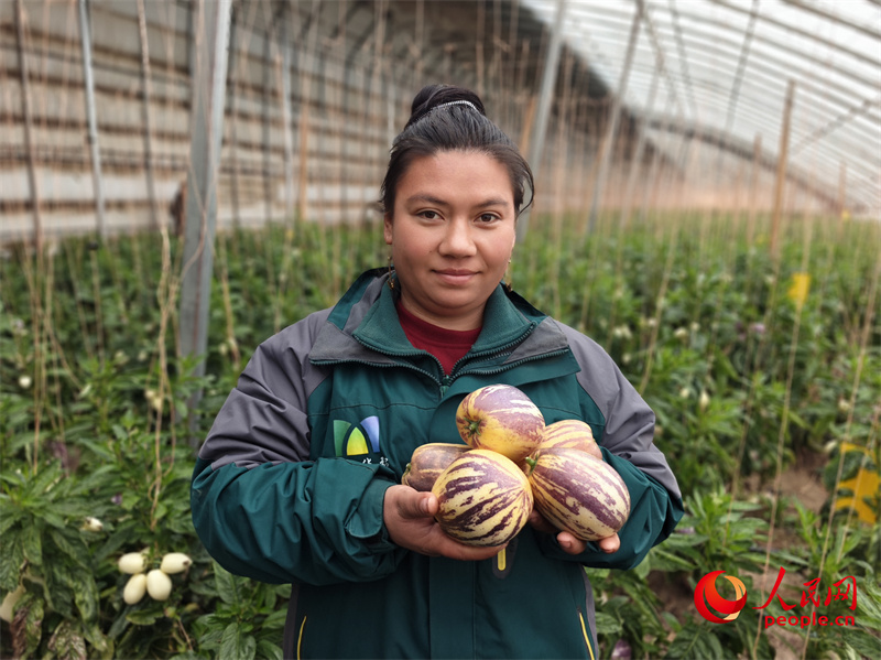 種植戶吾合麗尼薩·熱合曼承包的大棚里人參果豐收了。人民網記者 陳新輝攝
