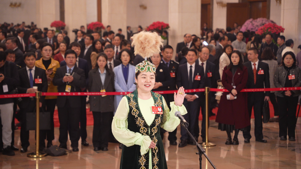 全國人大代表卓婭·巴合提在“代表通道”接受媒體采訪。人民網記者 張力洋攝