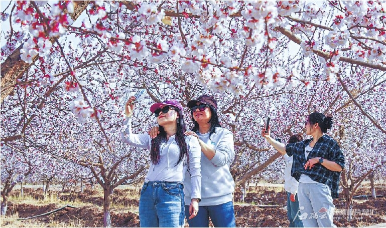 3月24日,游客在吐魯番火焰山下的杏花園踏春游玩。眼下,吐魯番數萬畝杏花競相綻放,吸引了眾多游客紛至沓來,感受春的氣息。劉健攝