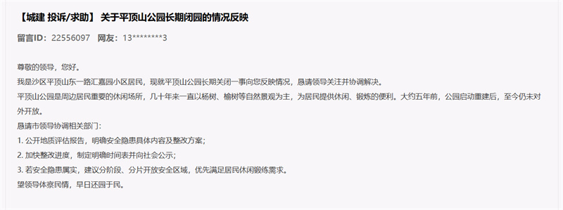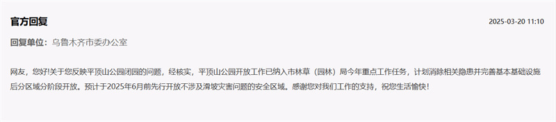 烏魯木齊市委辦公室接到“領導留言板”的留言后,對情況進行了核實,并回復網友,平頂山公園開放工作已納入烏魯木齊市林草(園林)局今年重點工作任務,計劃消除相關隱患并完善基本基礎設施后分區域分階段開放。預計于2025年6月前先行開放不涉及滑坡災害問題的安全區域。