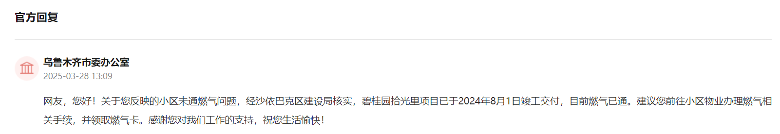 烏魯木齊市委辦公室接到留言后積極響應,回復表示,經沙依巴克區建設局核實,碧桂園拾光里項目已于2024年8月1日竣工交付,目前燃氣已通。建議前往小區物業辦理燃氣相關手續,并領取燃氣卡。