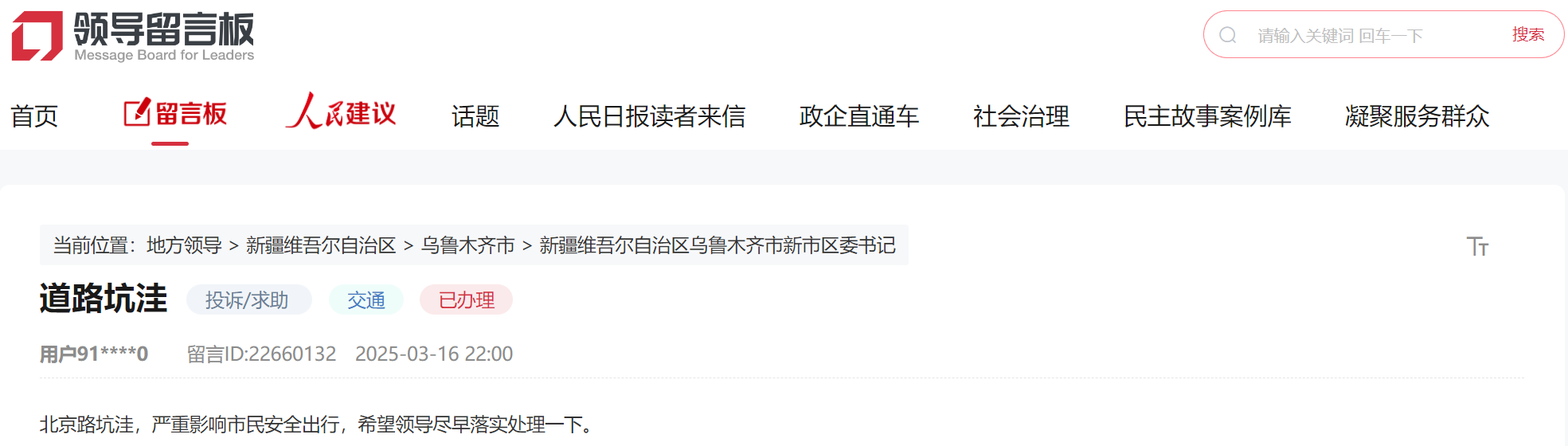 “北京路坑洼,影響市民安全出行?!本W友在烏魯木齊高新區(新市區)委書記版塊下留言,希望相關部門盡早落實處理道路坑洼問題。
