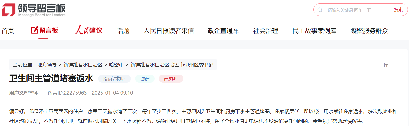 哈密市網友在人民網“領導留言板”反映,由于所住樓棟衛生間和廚房下水主管道堵塞,加之家里樓層低,家里三天被水淹了三次,這種情況每年至少三四次。曾多次與物業溝通,但無法解決問題,希望領導幫助盡快解決。