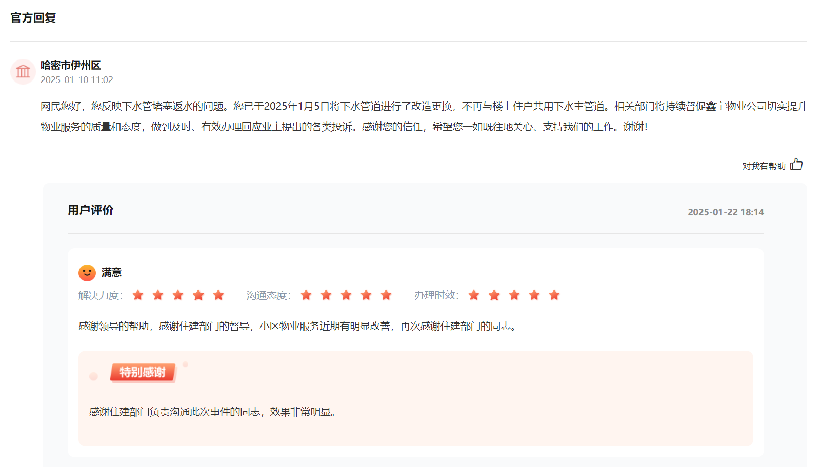“您反映下水管堵塞返水的問題,已將下水管道進行了改造更換,不再與樓上住戶共用下水主管道?!惫苁幸林輩^在接到留言后,迅速協調相關部門進行處理,下一步,相關部門將持續督促該小區物業公司切實提升物業服務的質量和態度,做到及時、有效辦理回應業主提出的各類投訴。