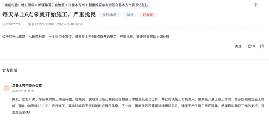 近日,網友周先生在人民網“領導留言板”上反映,烏魯木齊市某建筑工地早上6點左右開始施工,噪音嚴重擾民,影響了周圍居民的正常生活。