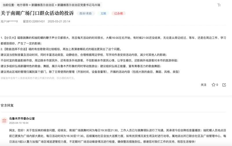 烏魯木齊市委辦公室回復:針對該問題,工作人員已與活動領隊溝通,承諾今后會降低音量播放;同時調整了抽陀螺活動的地點。后續,社區將進一步加強廣場區域的巡查力度,不定期檢查噪音情況,確保整改措施效果。