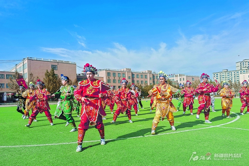 在疏附縣第二中學操場上,少年們手執雙槌,踩著鼓點翻飛跳躍,動作行云流水。