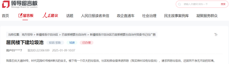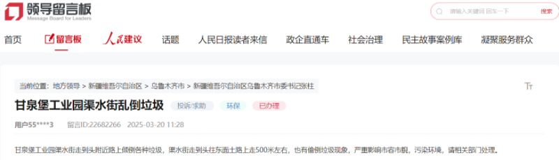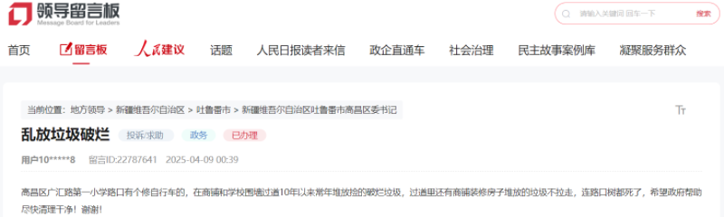 近期,新疆多名網友通過人民網“領導留言板”反映部分地方存在垃圾隨意傾倒、堆放問題,影響居民生活衛生環境。各地相關職能部門積極介入,及時回應群眾關切。