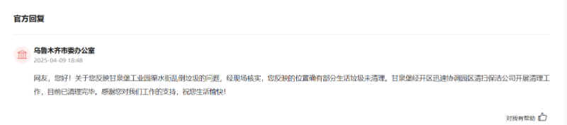 烏魯木齊市委辦公室回復:“關于您反映甘泉堡工業園渠水街亂倒垃圾的問題,經核查情況屬實,甘泉堡經開區迅速協調園區清掃保潔公司開展清理工作,目前已清理完畢?!?/p>