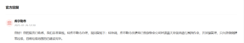 接到群眾反映后,庫爾勒市相關部門立即展開協調處理,庫爾勒市住建局已督促物業公司對該露天垃圾池進行圍擋,并加強管理,規定只允許傾倒建筑垃圾,目前垃圾池圍擋已建設完畢。
