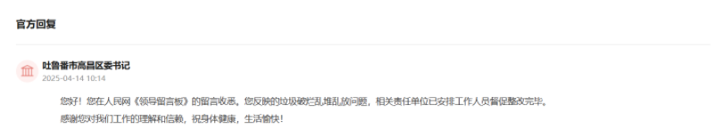 吐魯番市高昌區委書記回復該網友:“您反映的垃圾破爛亂堆亂放問題相關責任單位已安排工作人員督促整改完畢?!?/p>