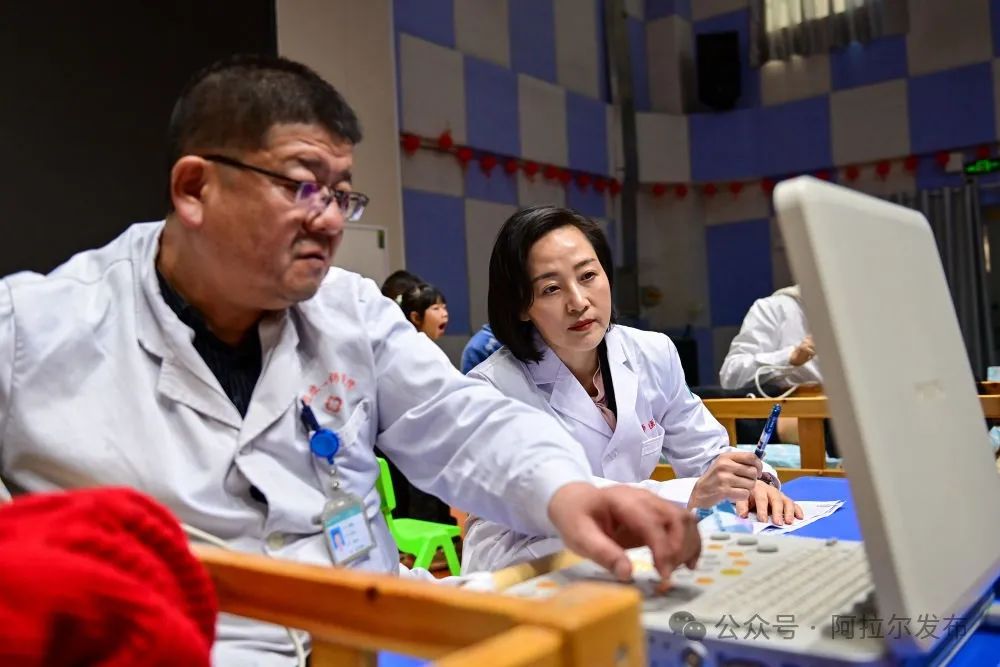 在新疆生產建設兵團第一師三團幼兒園,吳玲燕(右)帶領援疆專家為孩子們進行先天性心臟病篩查(2024年12月24日攝)。丁磊 攝