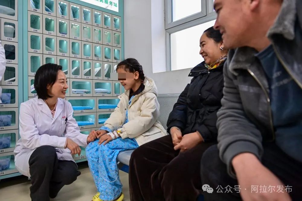 在新疆生產建設兵團第一師醫院,吳玲燕(左)鼓勵即將做手術的小朋友(2024年12月25日攝)。丁磊 攝