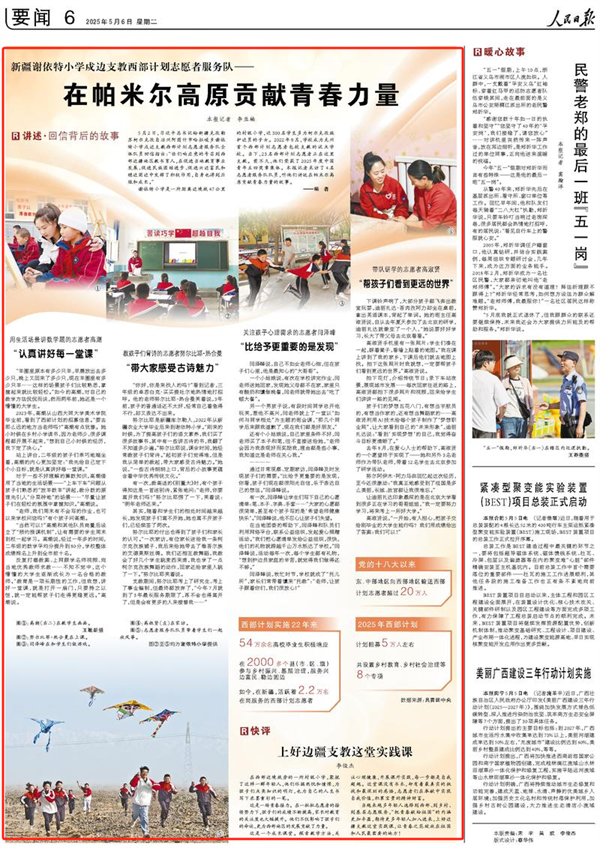 謝依特小學是一所距離邊境線47公里的村級小學,近300名學生多為柯爾克孜族護邊員的子女。2022年8月,學校成為克州首個西部計劃志愿者包校支教的試點學校。當下,23名西部計劃志愿者正在這里支教。前不久,他們榮獲了2025年度中國青年五四獎章集體。本報記者采訪了4名志愿者服務隊隊員,聽他們講述在帕米爾高原貢獻青春力量的故事。