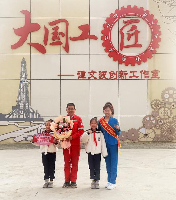 今年3月5日,“鮮花送雷鋒”形象大使和市綠雅小學“莊仕華中隊”學生代表將鮮花送給“大國工匠”、自治區道德模范譚文波(左二)。非爾代維斯·熱夏提攝