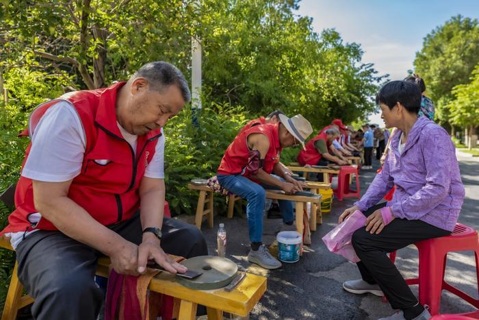 去年7月25日,克拉瑪依區昆侖街道南泉社區,“鐵老漢磨刀隊”成員為居民磨刀。田國建攝