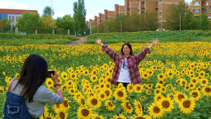 2024年9月,克拉瑪依區綠色康城口袋公園,兩位市民在花海中拍照留念。周建玲攝