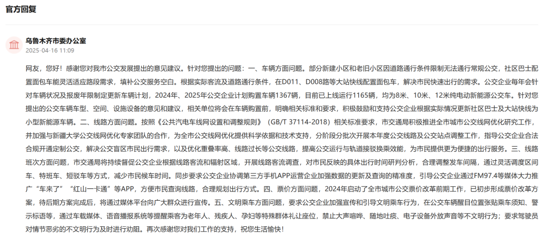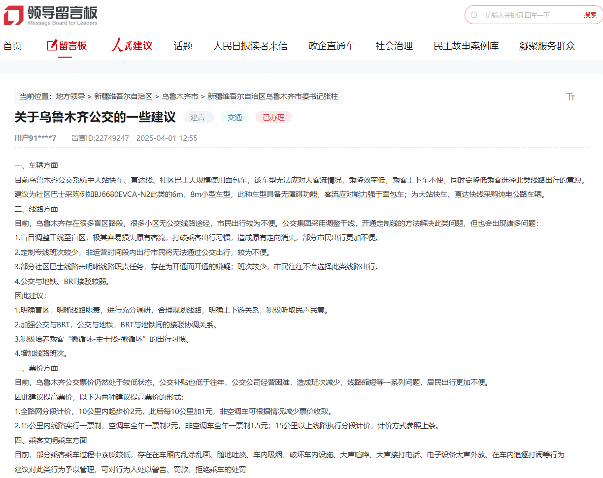人民建議丨烏魯木齊網友建言公交發展 官方積極回應解民憂