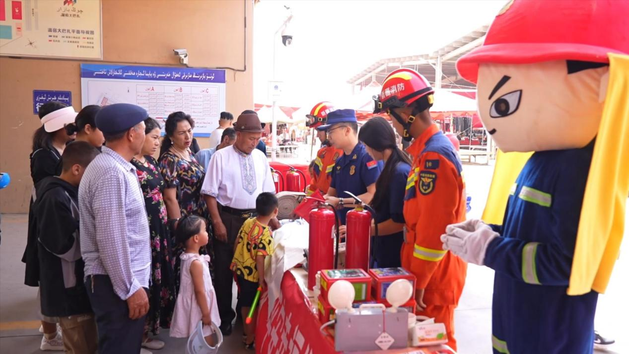 圖為阿克蘇地區消防救援支隊的消防宣傳員為趕巴扎的群眾講解了家庭防火常識。汪渝供圖