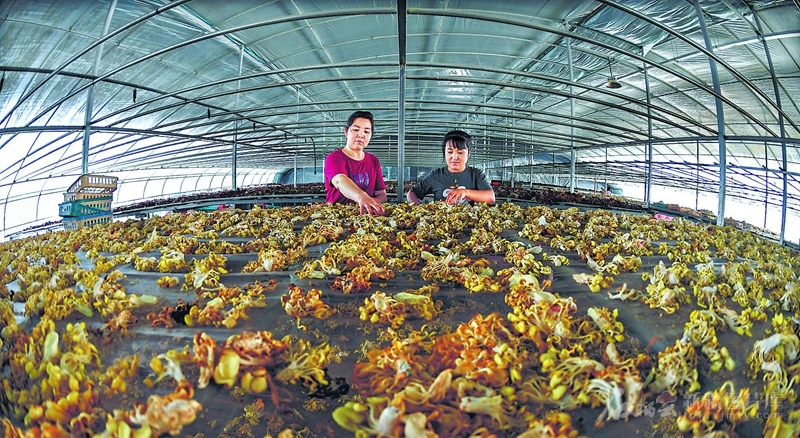 6月30日,工人在疏勒縣魯疆情食用菌生態科技示范園智能大棚里晾曬食用菌。 石榴云/新疆日報記者約提克爾·尼加提攝