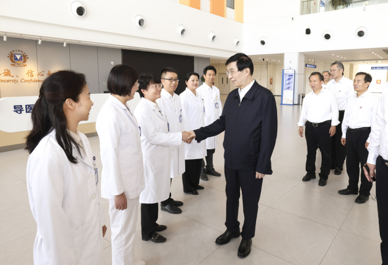 7月7日至9日,第十次全國對口支援新疆工作會議在新疆和田召開。中共中央政治局常委、全國政協主席王滬寧出席并講話。在新疆期間,王滬寧還到阿克蘇、和田和兵團第一師阿拉爾市、第十四師昆玉市等地調研,看望援疆干部人才和基層群眾。這是7月7日,王滬寧在浙大邵逸夫阿拉爾醫院同援疆醫療人才代表交流。新華社記者 龐興雷 攝