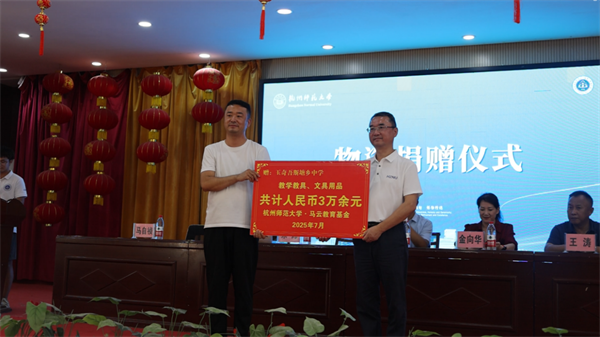 捐贈儀式上,杭州師范大學向庫車市玉奇吾斯塘鄉中學捐贈教學物資,馬云公益基金會代表與師生共同完成贈畫環節,同時還給“燭光”助學計劃的老師們頒發證書、授予錦旗,表達對杭州師范大學長期以來關心支持邊疆教育的誠摯感謝。