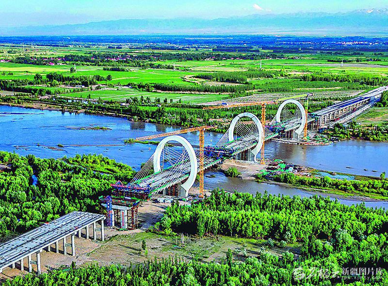 伊犁河三橋建設現場(5月21日無人機攝)。石榴云/新疆日報記者蔡增樂攝
