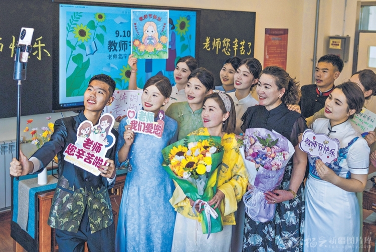 9月8日,在烏魯木齊市職業中等專業學校,學生和老師一起自拍,慶祝即將到來的第41個教師節。孫振嵩攝
