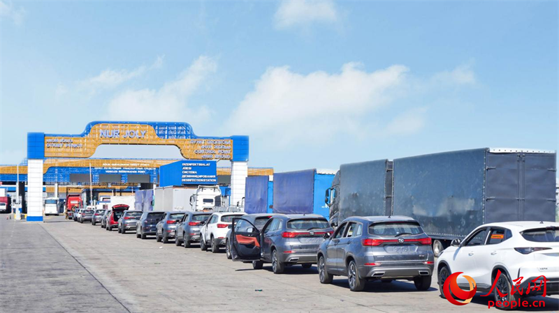 霍爾果斯公路口岸排隊出境的車輛。人民網 李欣洋攝