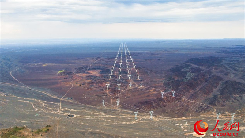 一座座銀色鐵塔聳立山野荒漠,這條“光明絲路”跨越2260公里,將新疆電送到重慶。人民網 李欣洋攝