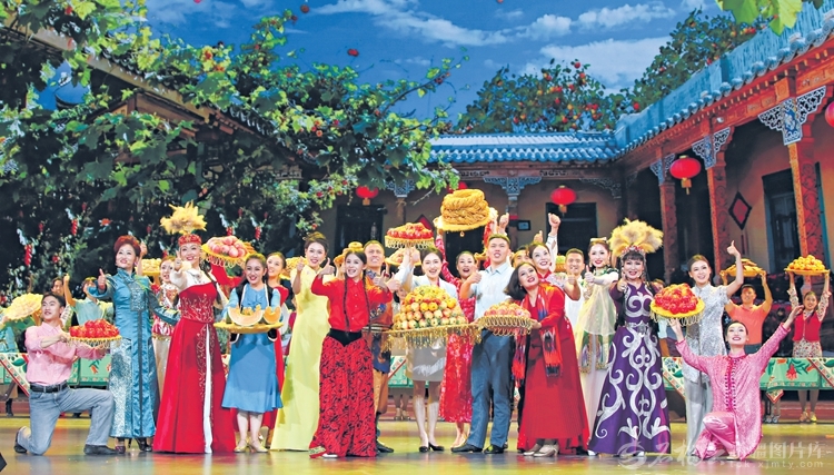 9月24日晚,慶祝新疆維吾爾自治區成立70周年文藝晚會《美麗新疆》在烏魯木齊文化中心大劇院舉行。圖為節目《天山青松根連根》《燃情歲月》《我的愛獻給祖國母親》。石榴云/新疆日報記者蔡增樂、湯永攝