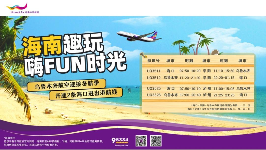 隨著冬季臨近,旅游市場客流將呈現“北上賞雪”與“南下避寒”雙向流動的態勢。烏魯木齊航空精準把握換季市場熱點,充分考慮季節性與地域性需求,開通2條貫穿南北的新航線,從??诔霭l,經停阜陽/瀘州飛往烏魯木齊,將陽光海島與中原腹地、西北邊陲緊密相連,搭建起華南沿海、川南地區與新疆地區之間的空中通道。旅客朋友可乘坐烏魯木齊航空的航班,體驗濱海風光搭配中原、川蜀歷史文化與西部冰雪奇觀的多元畫卷,享受別具一格的換季旅程。
