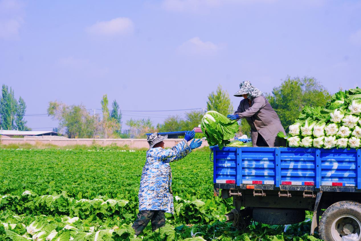 10月22日,在昌吉市六工鎮十三戶村,村民們正在收獲、裝運白菜。移志向攝