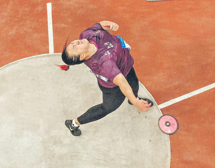 11月19日,新疆隊選手謝瑜宸在比賽中。當日,第十五屆全國運動會田徑項目女子鐵餅決賽在廣州舉行。新華社記者那宇奇攝