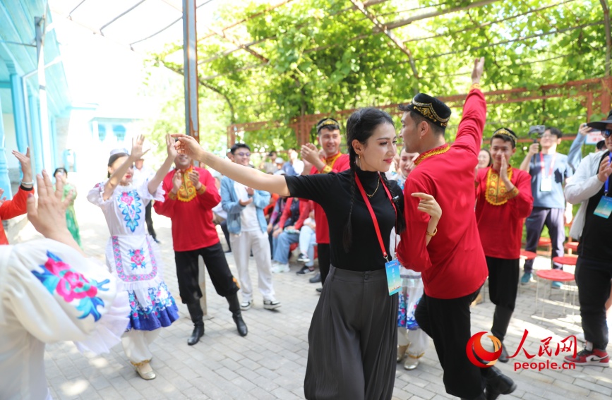 在新疆伊寧市喀贊其民俗旅游區,游客和市民跳起歡快的舞蹈(資料圖)。人民網 李龍攝