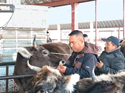 隨著黃公巴扎的交易越來越規范,“二膘牛區”“草膘牛區”“母牛區”……在牛交易市場,想買什么牛就直奔哪個交易區,省了經紀人好多事兒?!吧踔劣匈u家找來獸醫給牛做B超,就是要再提提懷胎母牛的‘身價’?!瘪R軍說。